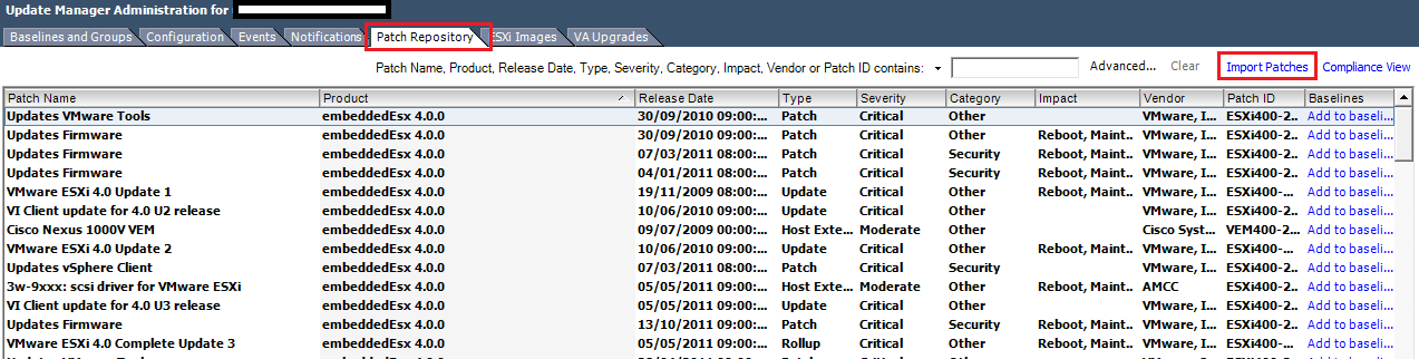 Once the import is completed, search for the package using the Patch Repository page, and then click “Add to baseline” if you want to add it to an existing baseline, or head over to “Baselines and Groups” if you want to create a new baseline. I need to apply this to specific test hosts first, so I don’t want to add to my existing baselines.