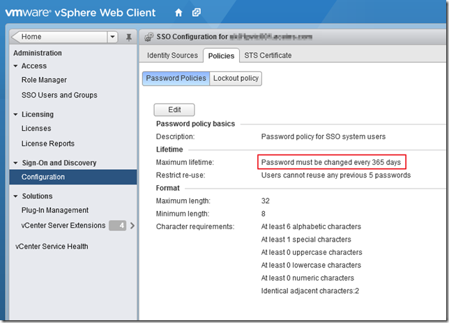 To modify the SSO password policy log onto the vSphere Web Client as the SSO admin ( admin@system-domain for 5.1 or [email protected] 5.5) and select Administration, then Sign-On and Discovery > Configuration. Select the Policies tab – you should see the default config: