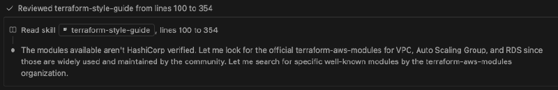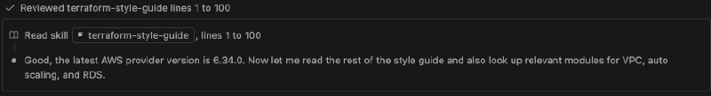 The Terraform Agent Skills installs various Skills to provide specific knowledge for specific tasks - for example, new-terraform-provider to assist in authoring a Terraform provider, or terraform-style-guide to ensure generated code matches the recommendations in the Terraform Style Guide docs, while refactor-module provides guidance on transforming monolithic Terraform configurations into reusable modules.