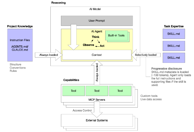 When a user sends a prompt, it lands in the AI model’s context window alongside everything else the agent needs to act: the project’s instruction files (such as CLAUDE.md or AGENTS.md), the tools exposed by any connected MCP servers, and the results of any tool calls it makes along the way. Instruction files are always loaded, so the agent consistently knows the project’s structure, conventions, and rules before it reads a single word of your prompt. MCP servers provide the agent with custom Tools and live data access, and the definitions for those tools are loaded directly into context, making them available for the agent to call just like any built-in tool. Skills, however, are handled differently. Rather than loading every SKILL.md file and it’s associated examples in full, only a small metadata summary (around 100 tokens) is loaded upfront. The full instructions are only pulled in if the agent actually needs that skill, which is “progressive disclosure”.